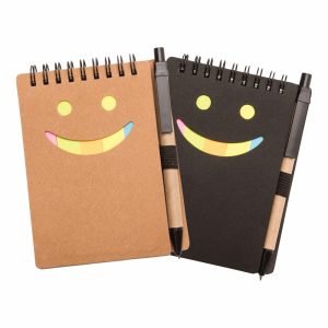 Descrição: Bloco de anotações ecológico com caneta de papelão. Possui detalhe “smile” na capa frontal(verso liso), caneta ecológica com acabamentos em plástico acionada por clique, primeira folha(branca) com cinco blocos autoadesivos coloridos com aproximadamente 20 folhas cada, bloco amarelo com aproximadamente 20 folhas e 70 folhas brancas pautadas.