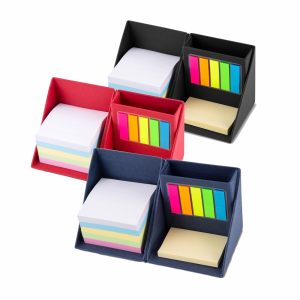 Descrição: Bloco de anotações formato cubo com autoadesivos, abre e fecha em diagonal. Possui 5 blocos autoadesivos com aproximadamente 20 folhas cada, bloco amarelo com aproximadamente 50 folhas e conjunto de blocos com 4 cores e aproximadamente 100 folhas cada. Possui suporte para caneta, clips e afins no compartimento atrás bloquinhos coloridos.